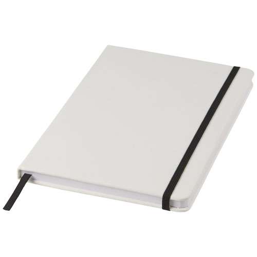 Notebook A5 bianco con chiusura elastica colorata e segnapagina coordinato. Composto da 80 pagine a righe (60g/m²). Stampa digitale disponibile per la copertina.