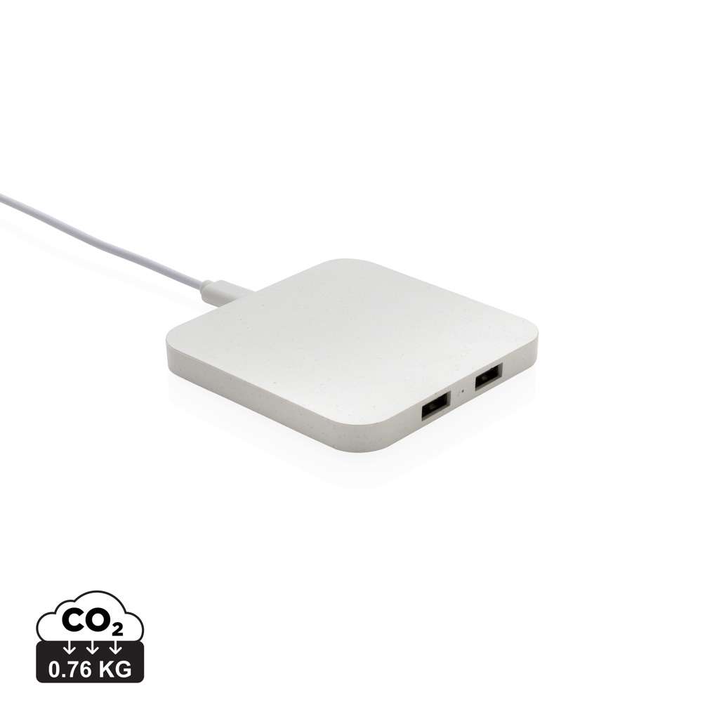 Caricatore wireless da 10W con due porte USB realizzato con ABS riciclato certificato RCS (Recycled Claim Standard). Contenuto totale riciclato: 57% in base al peso totale dell'articolo. La certificazione RCS garantisce una filiera completamente certificata dei materiali riciclati. Ricarica wireless compatibile con Android di ultima generazione, iPhone 8 e superiori. Articolo e accessori non contengono PVC. Include cavo di ricarica type C da 120 cm in TPE riciclato certificato RCS. Confezionato in scatola FSC mix. Type C in; input 5V/2A; 9V/1.67A. Output wireless 5V/1A; 9V/1,1A (10 W).