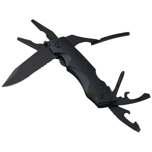 Coltello tascabile pratico e multiuso con 10 funzioni: pinze ad ago, pinze normali, taglierino, coltello a lama liscia, coltello seghettato, cacciavite philips x2, apriscatole, cacciavite a taglio e apribottiglie. Grazie alle dimensioni compatte, questo coltello multiuso è perfetto da tenere in tasca e viene fornito con un fodero in nylon resistente per poterlo agganciare comodamente alla cintura o allo zaino. Tutti gli utensili hanno un rivestimento in ossido nero, resistente alla ruggine e duraturo, e l'impugnatura è rivestita in carbonio. Quando il coltello è completamente aperto, il meccanismo liner-lock blocca la lama per impedirne il movimento durante l'utilizzo. Per richiuderlo, basta premere la leva del meccanismo liner-lock per sbloccare la lama. Con confezione regalo in cartone riciclato (14 x 6,7 x 5 cm).