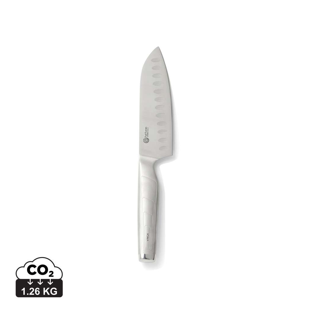 Coltello di alta qualità in acciaio giapponese (420 J2). Santoku è un coltello giapponese con un'elevata versatilità e quindi ricorda un tradizionale coltello da chef. La differenza è che il coltello Santoku ha una lama più corta che lo rende più veloce a tagliare e più comodo da utilizzare. Essendo estremamente maneggevole è un coltello universale.