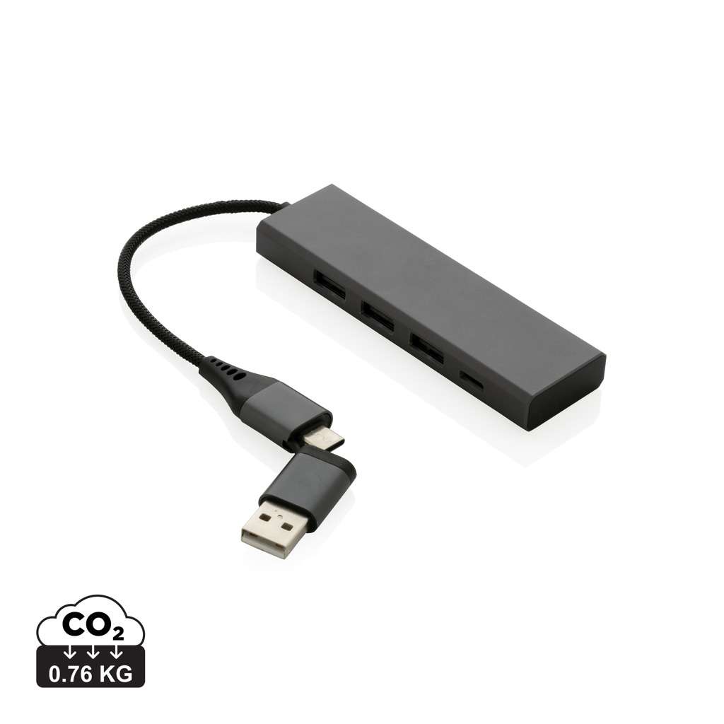 Hub USBrealizzato con alluminio riciclato certificato RCS (Recycled Claim Standard), ABS, TPE e PET. Con 3 porte USB A 2.0 e 1 porta type C. L'HUB ha un cavo integrato da 10 cm realizzato con materiale TPE/PET riciclato certificato RCS. Contenuto totale riciclato: 75% in base al peso totale dell'articolo. La certificazione RCS garantisce una filiera completamente certificata dei materiali riciclati. Include doppio connettore di ingresso, quindi è adatto sia per dispositivi type C che USB A. L'alluminio non perde le sue caratteristiche nel processo di riciclaggio e può essere riciclato all'infinito. Articolo e accessori 100% non contengono PVC. Confezionato in scatola FSC mix.