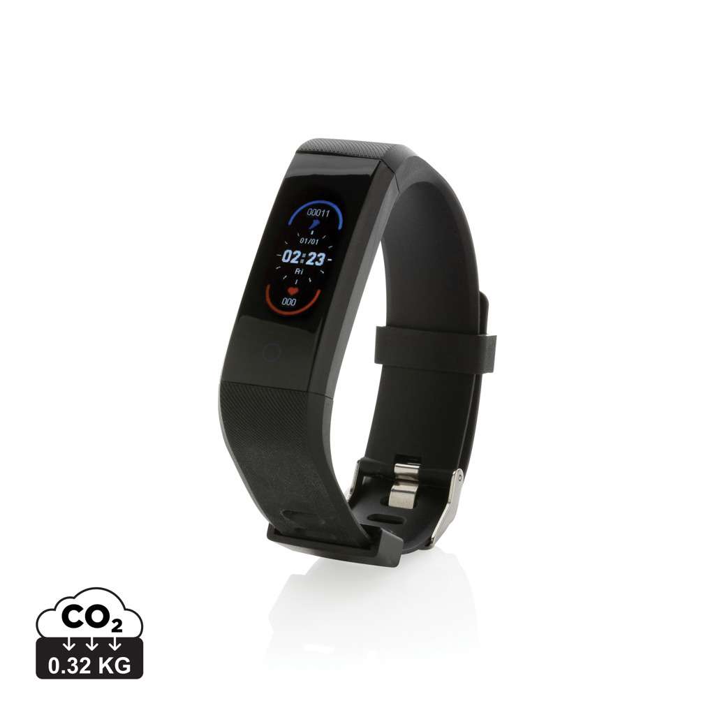 Fai ciò che è meglio per il tuo corpo con questo activity tracker impermeabile (IPX5) con comodo cinturino in TPU riciclato da indossare sia di giorno che di notte. Schermo a colori OLED touch da 0,96 pollici. Realizzato con fascia da braccio in TPU riciclato certificato RCS (Recycled Claim Standard) e cassa in ABS. Contenuto totale riciclato: 35% in base al peso totale dell'articolo. La certificazione RCS garantisce una filiera completamente certificata dei materiali riciclati. Include un'APP gratuita in 6 lingue per ottenere informazioni dettagliate sui tuoi risultati (per iOS 8.1 e Android 4.4 o versioni successive). BT5.0. Funzioni incluse: monitoraggio del sonno, contapassi, distanza, calorie, cardiofrequenzimetro, pressione sanguigna, ossigeno nel sangue, modalità multi-sport (11 e controllo della fotocamera. Con questo tracker di attività alla moda entrerai in uno stile di vita più sano. Autonomia in standby 15 giorni. In scatola FSC® mix.