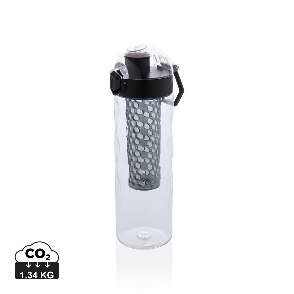 Aggiungi un aroma di frutta alla tua acqua. Questa botttiglia con particolari a nido d'ape ti permette di bere con una sola mano. Schiacciando il bottone il coperchio si apre automaticamente. C'è uno speciale meccanismo di chiusura che previene aperture del tappo accidentali. Include manico. La bottiglia è in durevole e innovativo tritan. E' inodore e non contiene BPA. Capacità 700 ml. Design registrato®