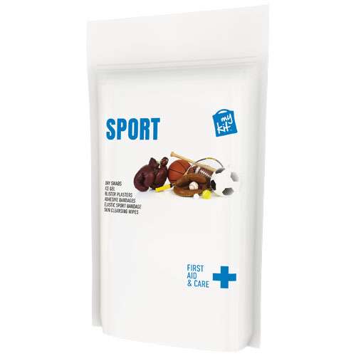 Il kit ideale per ogni sportivo. Questo kit vi prepara per piccoli incidenti. Contenuto: 12 cerotti resistenti all'acqua, 4 salviettine disinfettanti, 2 garze sterili, 2 gel freddo, 2 cerotto per vesciche, 1 benda elastica per sport. Tutti i prodotti contenuti nei MyKit rispettano le norme Europee vigenti. I prezzi includono stampa all-over fronte e retro. Fornito in una custodia di carta.