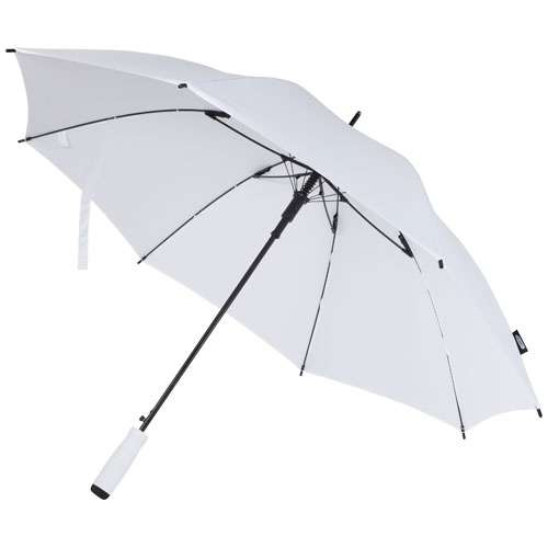 Ombrello ad apertura automatica da 23” con telo in poliestere pongee in PET riciclato. Presenta una robusta asta in metallo, un telaio in fibra di vetro e un comodo manico in EVA con estremità in colore abbinato. Ampia superficie di stampa presente su ogni pannello.