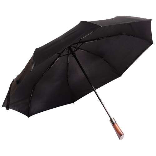 Ombrello pieghevole ad apertura/chiusura automatica che combina un artigianato classico alla durata moderna. Realizzato in tessuto pongee 210T in PET riciclato idrorepellente, presenta una robusta asta in legno e stecche flessibili in fibra di vetro per una maggiore resistenza al vento. Il pulsante integrato consente un'apertura e una chiusura rapida e semplice. Dispone anche di una custodia in EVA resistente all'acqua e include una custodia per ombrello abbinata. La personalizzazione è disponibile sulla piastra in metallo del pulsante di chiusura. Fornito in una confezione regalo cilindrica, realizzata in carta riciclata.