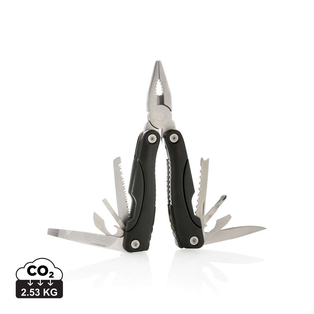 Pinza multifunzione in alluminio, impugnatura con inserti neri, 14 funzioni, confezionato in custodia nera 600D.