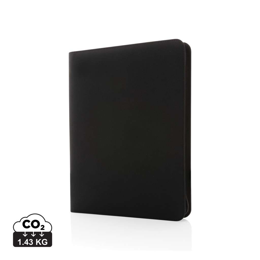 Questo portadocumenti 300D deluxe tech A4 Impact AWARE™ con cerniera dà un tocco di raffinatezza al tuo lavoro. Organizza i tuoi documenti importanti, carte e note. Include un blocco A4 in carta riciclata da 64 gm/2 da 20 pagine. All'interno c'è 1 tasca per telefono, un supporto per telefono, portapenna e 2 scomparti per biglietti da visita. Con tracciante AWARE™ che garantisce l'uso reale di materiali riciclati. Ogni portadocumenti e riutilizza 8 bottiglie in PET da 0,5 litri. Il 2% del ricavato di ogni prodotto Impact venduto sarà devoluto a Water.org. Senza PVC.