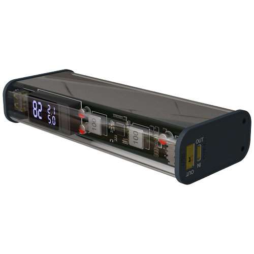 Questo power bank trasparente e portatile da 20.000 mAh è il compagno perfetto per ricaricare un laptop mentre viaggi o lavori da remoto. Il power bank include un cavo di ricarica 3 in 1 da 5 A, una doppia uscita USB-A e una porta USB-C. Fornito con una custodia in cotone riciclato per riporlo facilmente durante i viaggi o gli spostamenti. Dimensioni del power bank: 15,4 x 6,6 x 3,2 cm. Fornito in una confezione regalo in carta riciclata (23,15 x 8,75 x 3,9 cm) con chiusura magnetica. Garanzia di 3 anni inclusa.
