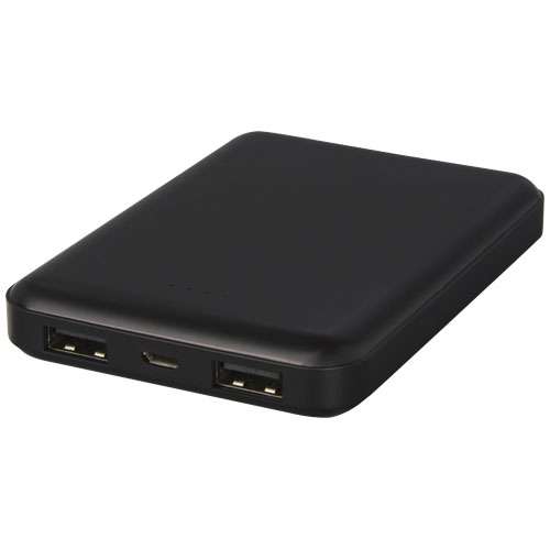 Power bank piatto e resistente con batteria ai polimeri da 5000 mAh. Può essere inciso a laser sul pannello frontale, in modo che il logo si illumini quando il power bank è acceso o in uso. Uscita: 5V/2A. Ingresso: 5V/2A. Non è fornito alcun cavo accessorio per rendere il prodotto più sostenibile.