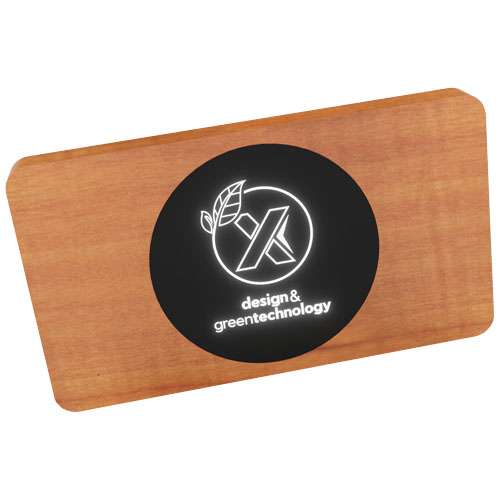 Power bank wireless in legno da 5.000 mAh con logo luminoso. Il logo si illumina per 30 secondi quando la batteria è carica. Fornito in una confezione regalo di carta riciclata, con un cavo 3 in 1 (iPhone/Android/Tipo-C) realizzato in RPET (bottiglie riciclate). Doppia uscita USB 2 A.
