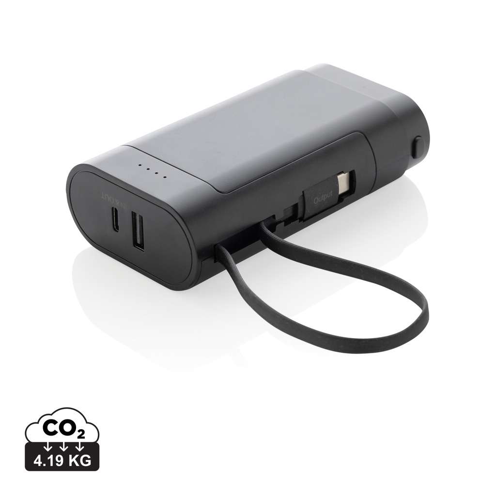 Powerbank dal design unico che favorisce il riciclo della batteria al termine del ciclo di vita del prodotto. È sufficiente aprire la Powerbank e rimuovere la batteria di grado A per riciclarla in modo sicuro e responsabile. La Powerbank da 10.000 Mah è dotata di un cavo type C integrato che può essere facilmente collegato al dispositivo per iniziare subito la ricarica. Il cavo può essere utilizzato anche per ricaricare la Powerbank stessa. Con un connettore aggiuntivo type C per collegare il proprio cavo di ricarica. Realizzata in ABS e TPE riciclato. Contenuto totale di materiale riciclato: 30% in base al peso totale del prodotto. La certificazione RCS garantisce una catena di approvvigionamento di materiali riciclati completamente certificata. Confezionato in un imballaggio FSC® Kraft. Senza PVC. Input: 5V/2.1A Output 5V/2.4A.