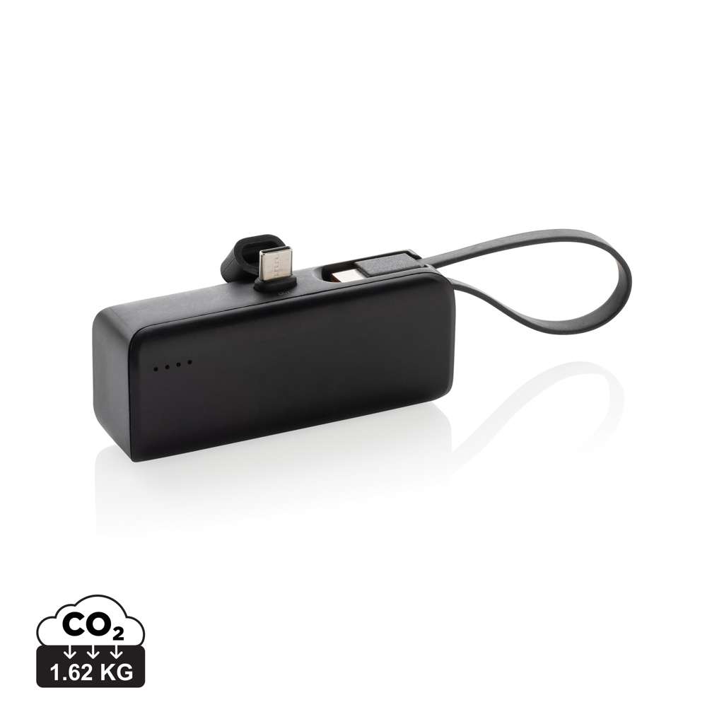 Powerbank portatile e tascabile, facile da portare in viaggio. La powerbank è dotata di un connettore type C per ricaricare sia gli smartphone Android che gli iPhone più recenie (a partire dal 14). La powerbank da 3000 mAh è dotata anche di un cavo di input e output USB C integrato che può essere utilizzato per caricare altri dispositivi USB C e per ricaricare la powerbank. Non è necessario portare con sé alcun cavo per utilizzare o ricaricare questa powerbank. Realizzata con ABS e TPE riciclato. Contenuto totale riciclato: 19% in base al peso totale dell'articolo. La certificazione RCS garantisce una catena di approvvigionamento dei materiali riciclati completamente certificata. Confezionata in un imballaggio FSC®. Senza PVC. Input: 5V/2.1A Output 5V/2.4A.
