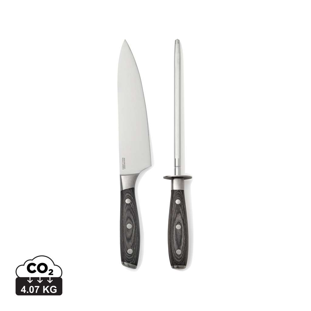 Coltello da chef e affilatore in acciaio della gamma Kaiser. Il coltello è realizzato in acciaio tedesco X50CrMoV15 e il manico in legno di Pakka. L'impugnatura di facile presa e l'eccezionale equilibrio della lama rendono il coltello comodo e facile da usare. Le proprietà intrinseche dell'acciaio tedesco rendono la lama resistente alle macchie e non richiede più cure di un'affilatura occasionale. Coltello da cuoco: lama da 20 cm. Affilatora acciaio: 33 cm.