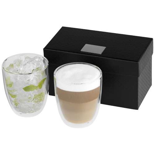 Set di bicchieri da 290 ml con isolamento a doppia parete. Ideale per servire latte macchiato, tè freddo o qualsiasi bevanda calda o fredda. Presentato in elegante confezione regalo. Placchetta per logo inclusa.