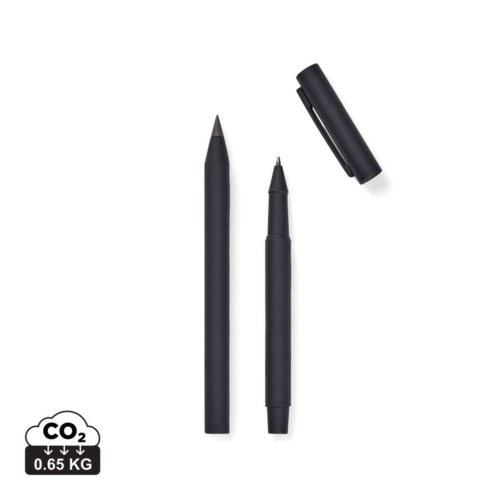 Questo moderno ed elegante set comprende due penne: una eterna e una classica penna a sfera con cappuccio e clip. Progettate per garantire stile e funzionalità, queste penne sono realizzate in acciaio inossidabile riciclato certificato RCS, con un rivestimento superficiale in gomma per una presa confortevole e una finitura opaca. Entrambe le penne hanno un peso bilanciato che garantisce stabilità e scrittura senza sforzo. La penna eterna offre una scrittura senza limiti. La penna a sfera è dotata di una punta fine da 1,00 mm e garantisce una scrittura fluida e costante con inchiostro blu documentale, che dura fino a 1200 metri. La certificazione RCS garantisce che l'intera catena di approvvigionamento dei materiali riciclati sia certificata. Il contenuto totale di materiale riciclato si basa sul peso complessivo del prodotto. Questo prodotto contiene il 52% di alluminio riciclato certificato RCS e il 10% di acciaio inossidabile certificato RCS.