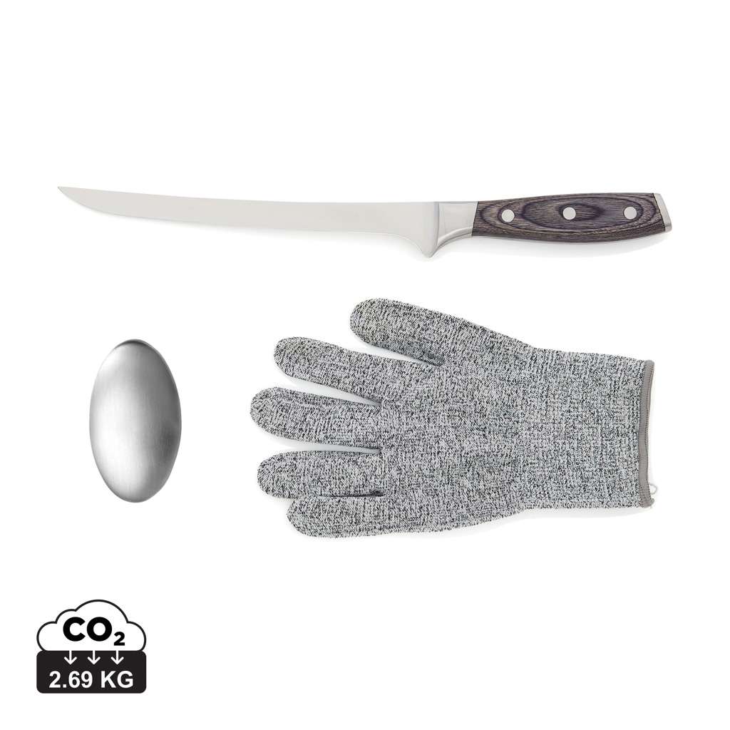 Set per sfilettare il pesce composto da coltello, guanto in rete d'acciaio e saponetta in metallo. Il guanto offre una presa extra sul pesce proteggendoti da eventuali incidenti. Il sapone metallico rimuove facilmete gli odori del pesce e delle cipolle. Il coltello è realizzato in acciaio tedesco X50CrMoV15 con manico in Pakkawood. L'impugnatura di facile presa e l'eccezionale equilibrio della lama rendono il coltello comodo e facile da usare. Dimensioni: lama da 21 cm.