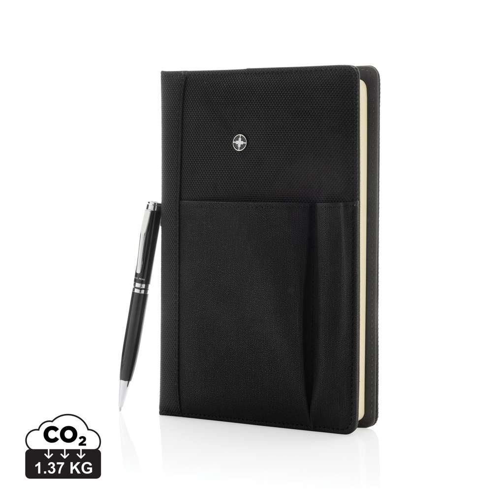 Taccuino in poliestere 1680D e 680D con penna. Include taccuino removibile con 192 pagine da 80 g/m2. Tasca frontale porta smartphone. In confezione regalo Swiss Peak.