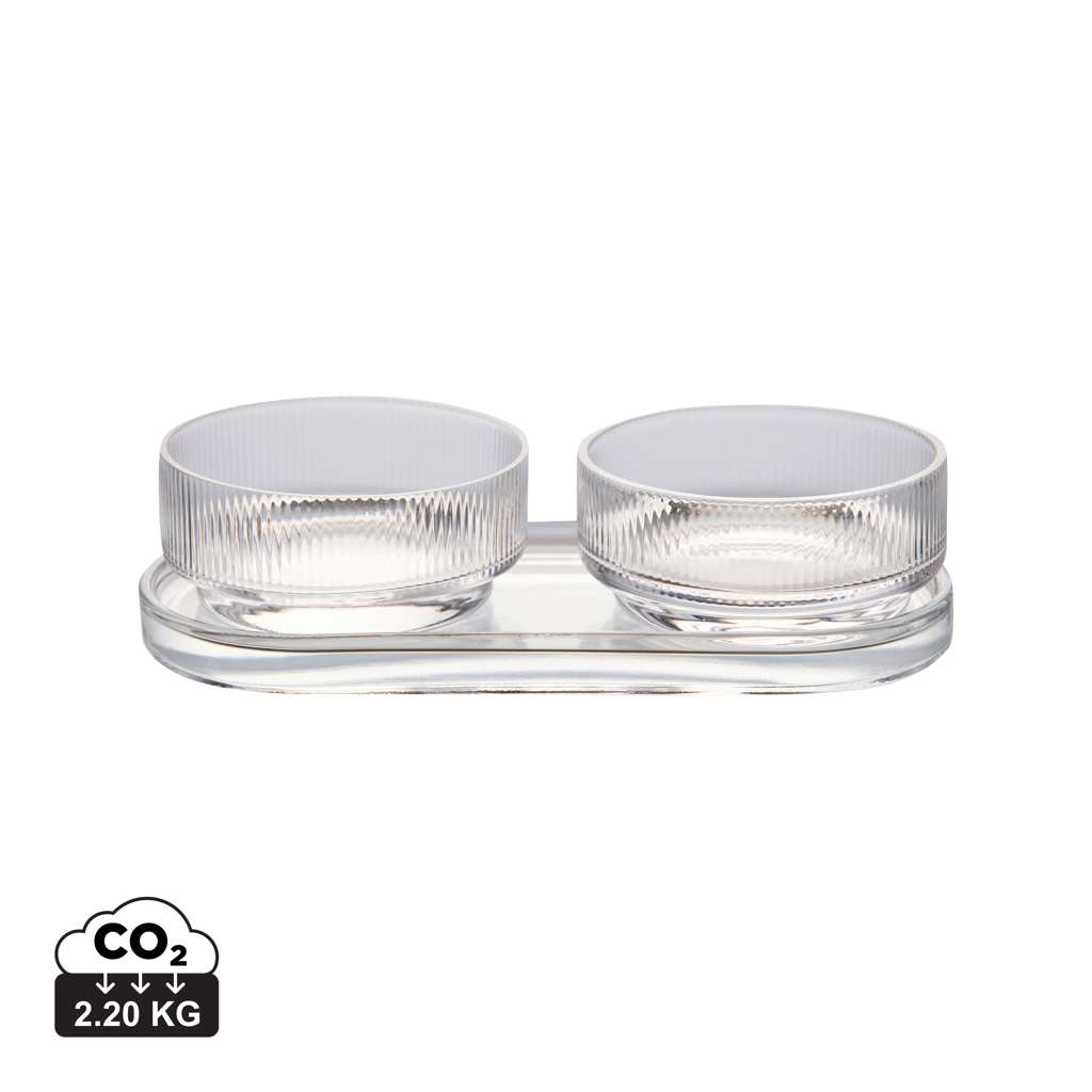 Un set da tapas dal design intramontabile e dalle linee classiche e pulite. Perfetto per ogni occasione in cui desideri servire piccoli piatti, snack o altri contorni con stile ed eleganza. Il set comprende due ciotole e un vassoio, che possono essere utilizzati insieme o separatamente. Realizzato in vetro sodico-calcico. Le ciotole hanno una capacità di 250ml. Lavabile in lavastoviglie.