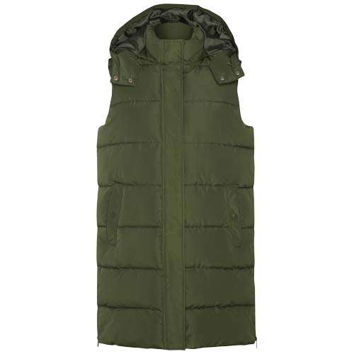 Smanicato imbottito con cappuccio rimovibile. Collo alto. Chiusura anteriore con zip nascosta da pattina. Due tasche con chiusura con bottone automatico. Aperture laterali con cerniere. Accesso interno sul petto. Idrorepellente.