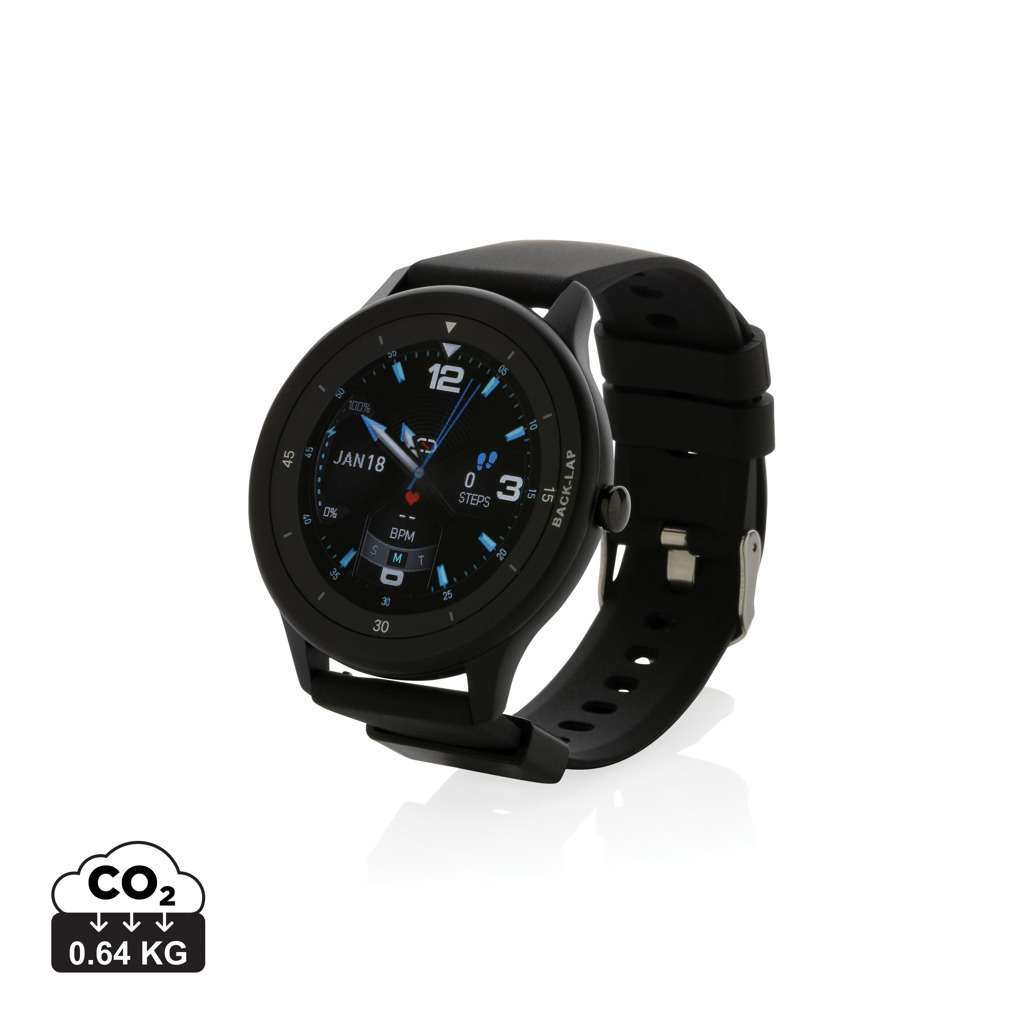 Orologio moderno ad alte prestazioni con touch screen da 1,28 pollici a risposta rapida per monitorare le tue attività tutto il giorno. Display ad alta risoluzione. Realizzato con cinturino in TPU riciclato certificato RCS (Recycled Claim Standard) e cassa in lega di zinco. Contenuto totale riciclato: 23% in base al peso totale dell'articolo. La certificazione RCS garantisce una filiera completamente certificata dei materiali riciclati. Le caratteristiche includono: conteggio passi, calorie, distanza, sveglia con monitoraggio multi-sport (24 tipi), monitoraggio della frequenza cardiaca, monitoraggio della pressione sanguigna, monitoraggio del sonno, aggiornamenti del calendario, notifiche: SMS, Facebook, Skype, WhatsApp, Twitter ecc. Compatibile con Android 4.4 e IOS 8.0 e versioni successive. IPX 68 resistente all'acqua e alla polvere. BT 5.0. Tempo di standby di 25 giorni e tempo di lavoro fino a 7 giorni. Incluso caricatore a clip. 100% senza PVC.