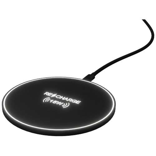Stazione di ricarica wireless extra sottile da 15 W (10 x 7,2 cm) realizzata in plastica ABS con una finitura soft-touch. La base rotonda è adatta per l'incisione laser, che illumina il logo. Quando la stazione di ricarica è in uso, la luce sul bordo diventa bianca, mentre quando è in modalità di ricarica la luce è blu. Consegnato con un cavo di ricarica da 75 cm USB-A/Type-C realizzato in PET riciclato. Fornito in una confezione regalo (14,9 x 11,8 x 2,1 cm) con chiusura magnetica. Garanzia di 3 anni inclusa.