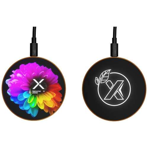 Stazione di ricarica wireless da 10 W realizzata in gomma e legno con cavo di ricarica realizzato in plastica PET riciclata. Può essere decorata con un logo luminoso. Fornita in confezione regalo realizzata in carta kraft nera con meccanismo di chiusura magnetico. Brevetto EUIPO EUROPA.