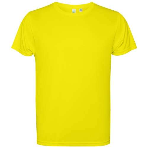 T-shirt tecnica a maniche corte da bambino. Collo con cuciture abbinate. Orlo posteriore leggermente più lungo di quello anteriore. Cuciture laterali spostate in avanti.