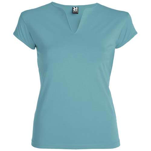 T-shirt aderente con girocollo e apertura a V sulla parte anteriore. Mezze maniche con bordo e cuciture laterali. Tessuto di elevata qualità con una sensazione morbida e piacevole al tatto. Etichetta rimovibile. La modella è alta 179 cm ed indossa una taglia S.