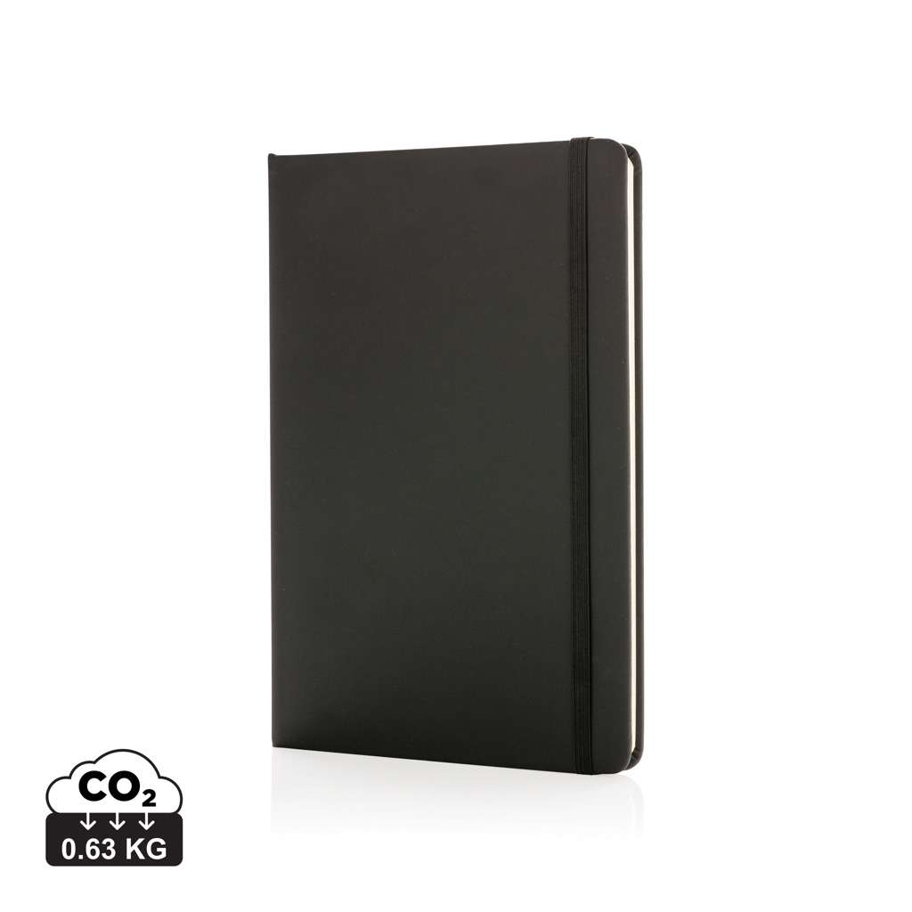 Taccuino A5 in PU con copertina rigida con chiusura elastica e nastro segnapagina nero. 144 pagine da 70 g/m2. Pagine color crema.