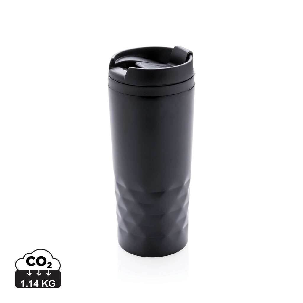 Tazza in acciaio inossidabile con inserti geometrici alla moda. Interno in plastica. Non va in lavastoviglie. Capacità 300 ml.