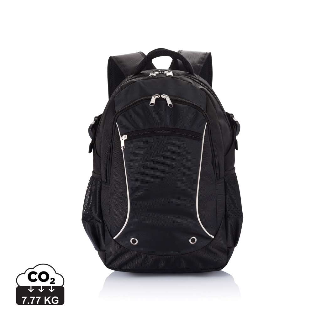 Zaino in tessuto 1680D jacquard. Tasca frontale con cerniera e organizer all’interno. Scomparto principale portacomputer da 15,4” con tasca imbottita. Profili riflettenti. Tasche in rete. Senza PVC.